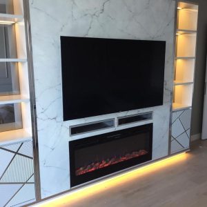Mobilyadan yapılan TV ünitesi içine 160 cm elektrikli şömine kullanılmıştır.