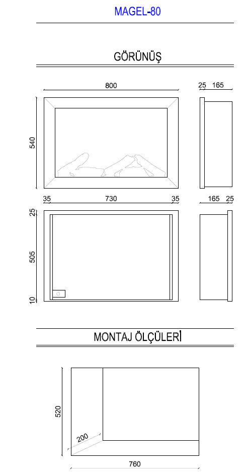 - Montaj Ölçüsü : 76 cm x 52 cm x 20 cm