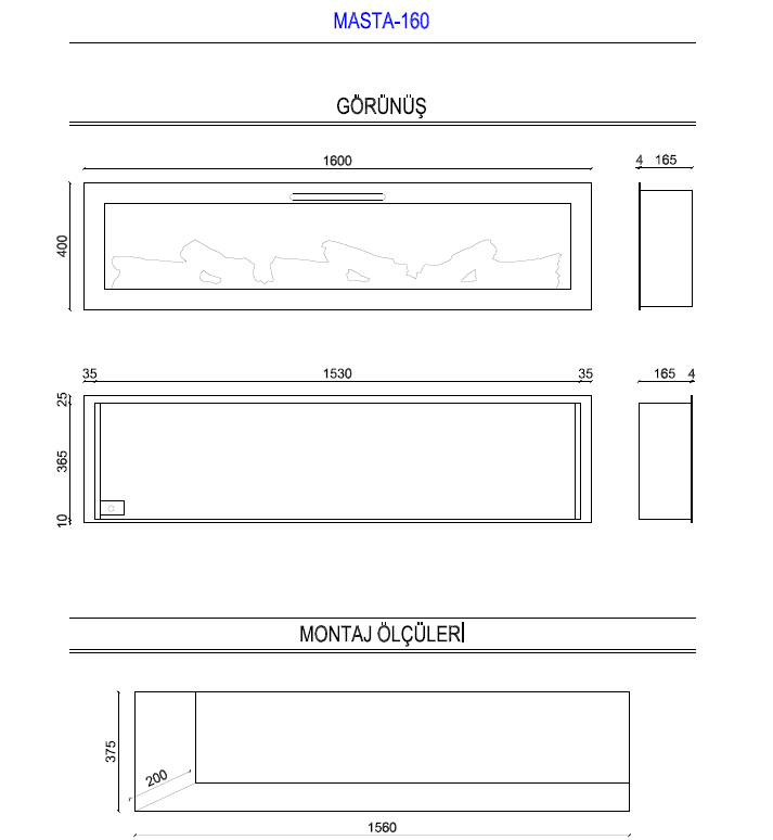 - Montaj Ölçüsü : 156 cm x 37,5 cm x 20 cm